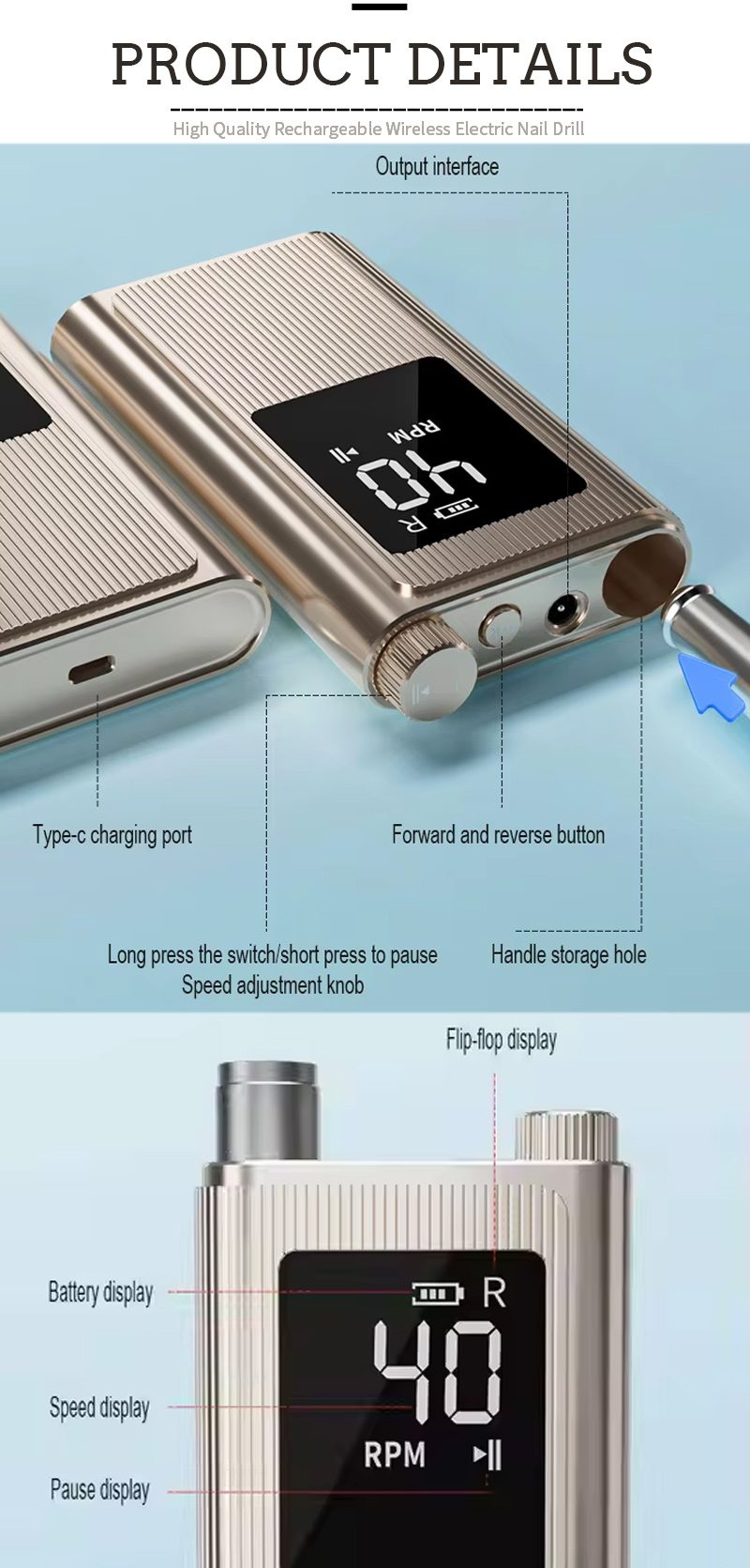 የዚህ የ 40,000 ራም / ደቂቃ ከፍተኛ ፍጥነት ያለው የባለሙያ የጥፍር መሰርሰሪያ የማሳያ ዲዛይን ማብሪያ / ማጥፊያ / ማጥፊያ እና ወደፊት / የተገላቢጦሽ ማብሪያ / ማጥፊያ በድምሩ አንድ አዝራር ማግበር ፣ ከታች በፍጥነት የሚሞላ ሶኬት ፣ በላዩ ላይ ሊተካ የሚችል መሰርሰሪያ ሶኬት እና የተለያዩ ፍላጎቶችን ለማሟላት ባለ ሶስት ቦታ የሚስተካከለው ፍጥነት አለው።