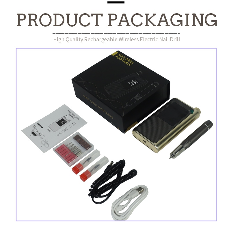 የዚህ ባለ 40,000 ክ / ደቂቃ ባለከፍተኛ ፍጥነት የባለሙያ የጥፍር መሰርሰሪያ ጥቅል የአሸዋ ብዕር ምርት ፣ የዩኤስቢ ኃይል መሙያ ገመድ ፣ የምርት መመሪያ እና ቀላል ክብደት ያለው እና ተንቀሳቃሽ ሳጥን አለው።