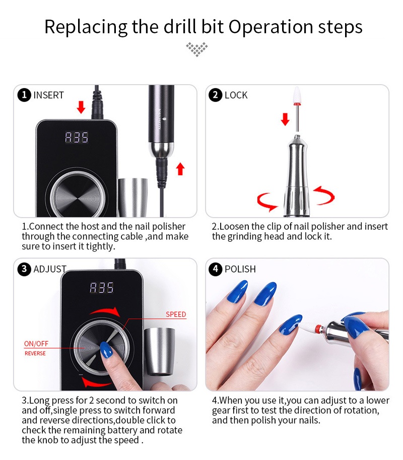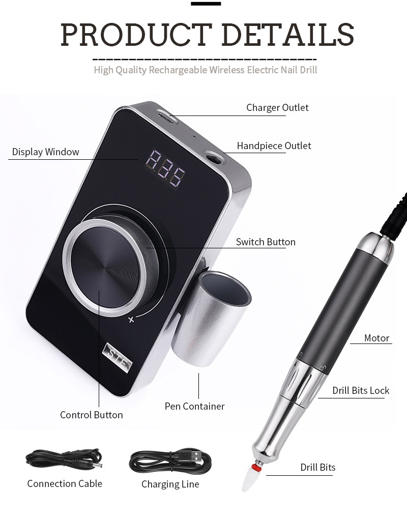 ይህ የሚያራግፍ 35,000 ደቂቃ የኤሌክትሪክ የጥፍር መሰርሰሪያ መሰርሰሪያ መሰርሰሪያ, ማለትም ተሰኪ እና ነቅለን, ቀላል እና ምቹ, ምትክ ከተጠናቀቀ በኋላ ጥቅም ላይ ሊውል ይችላል.