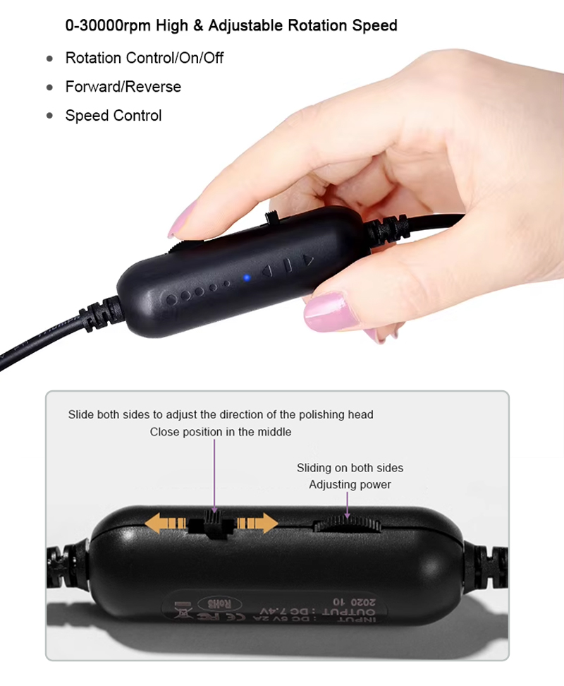 1 ፣ የሚስተካከለው ፍጥነት ፣ ኃይለኛ ሞተር ፣ ከፍተኛ ፍጥነት ማጠሪያ ፣ ማለቂያ በሌለው የእውነተኛ ጊዜ ፍጥነት ማስተካከያ።