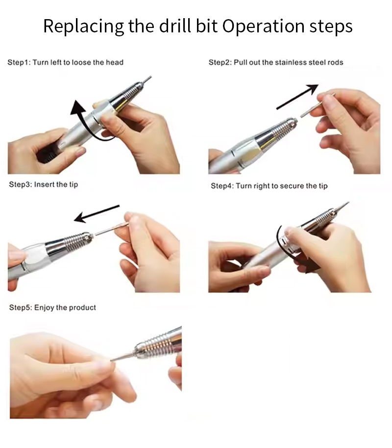 ይህ ፕሮፌሽናል ተንቀሳቃሽ የጥፍር መሰርሰሪያ ማሽን 35,000 rpm የምትክ መሰርሰሪያ አሰራር ዘዴ ማለትም ተሰኪ እና ነቅለን ቀላል እና ምቹ, ምትክ ከተጠናቀቀ በኋላ ጥቅም ላይ ሊውል ይችላል.